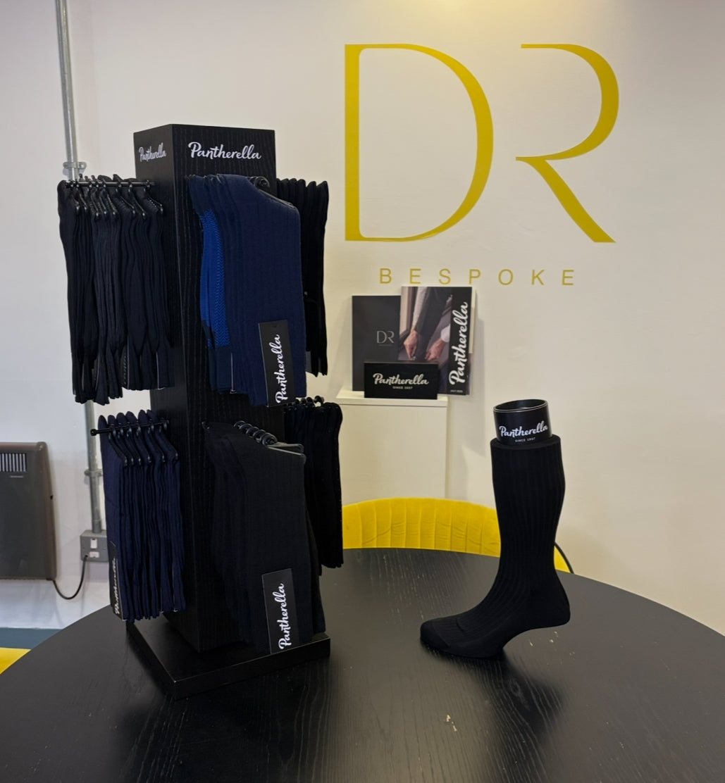 Experience British craftsmanship at its finest — Pantherella socks, made in England since 1937, now available at DR Bespoke.